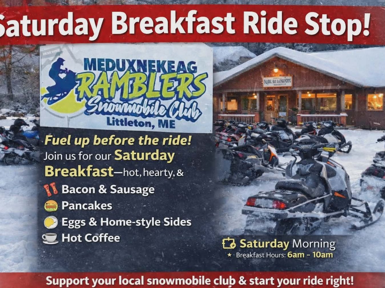 Every Saturday starting January 3rd of 2026 and following through to March 28th, 2026, from 6:00 to 10:00 A.M. MRSC serves up a buffet for breakfast with all the fixings for only $12.00 per person. you won't leave hungry! We encourage you arrive on snowmobile or even travel by vehicle but please mark your calendars.